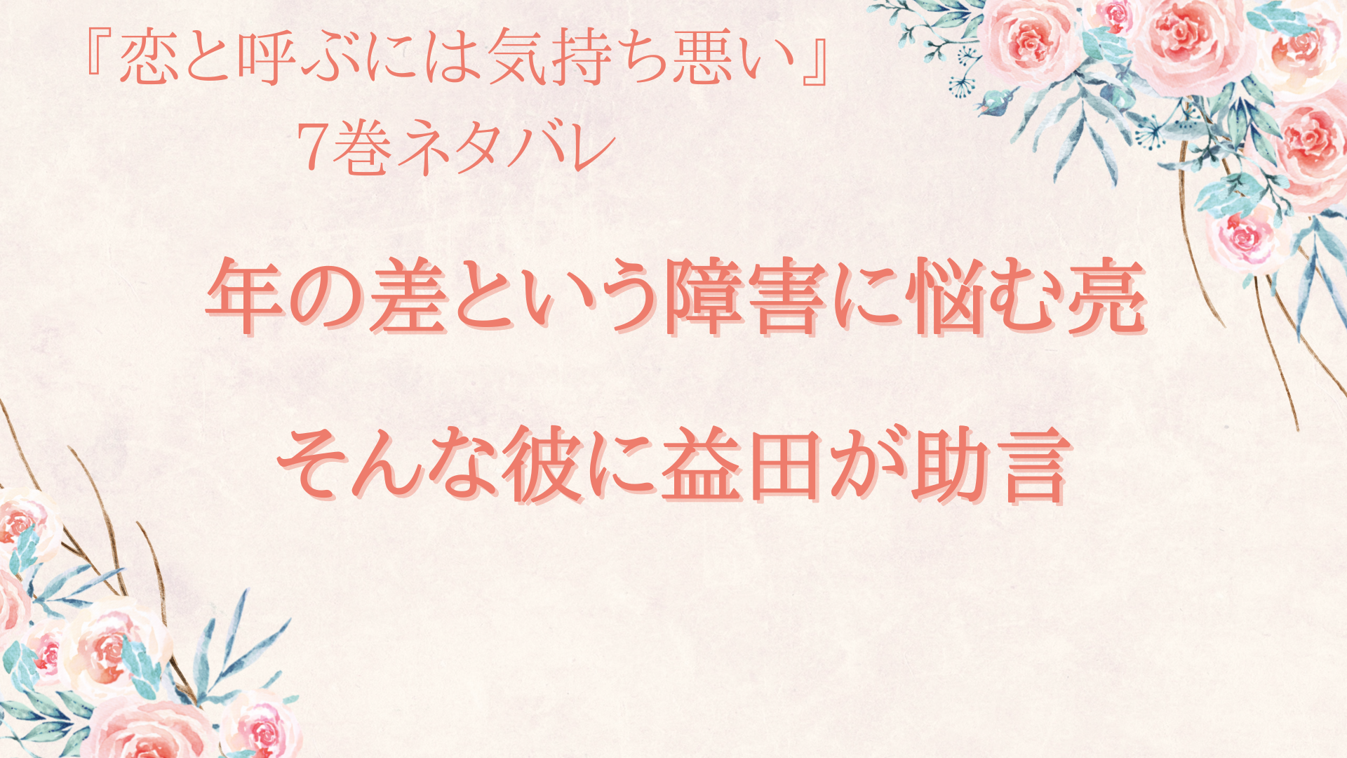 Web 恋と呼ぶには気持ち悪いのネタバレについて 「恋と呼ぶには気持ち悪い」1巻のネタバレですが、 サラリーマンの名前は天草亮 といいます。 顔良し頭良し給料良しスタイルWeb 恋と呼ぶには気持ち悪い最新&完結8巻51話ネタバレ「春になれば」 ある夜、亮は仕事帰りに益田と電話していました。 益田はがっかりした様子です。 益田が花見の予定をWebアニメ恋と呼ぶには気持ち悪い 6話話感想 快のあまりにもはっきりとした発言に、ちょっと男らしさを感じてしまいました。 有枝も一気に亮に夢中になっていますね。
